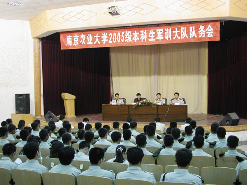 9月10日下午2:30,南京农业大学2005级本科新生军训大队队务会在大学生活动中心召开。承训部队(临汾旅)官兵、各学院辅导员、军训工作人员共80余人参加了会议。会议由人武部部长、2005级本科生军训工作领导小组办公室主任胡正平主持,校党委副书记、2005级本科生军训工作领导小组组长庄娱乐出席大会并发表讲话。