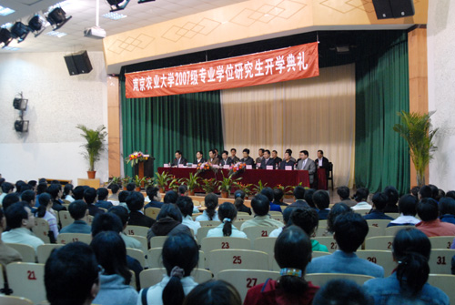 4月19日上午10:00时,我校2007级专业学位研究生开学典礼在大学生活动中心隆重举行。江苏省农林厅、办学合作单位及相关学院有关领导以及2007级专业研究生新生等400多人参加了典礼。开学典礼由研究生院培养处宋华明处长主持,副校长、研究生院常务副院长曲福田教授参加典礼并致辞。
