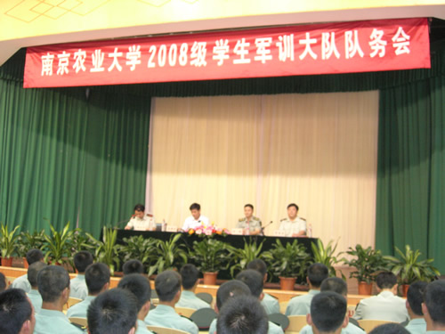9月7日下午2:30,南京农业大学2008级本科新生军训大队队务会在大学生活动中心召开。承训部队(临汾旅)官兵、各学院辅导员、军训办公室工作人员共八十余人参加了会议。校党委副书记、2008级本科生军训工作领导小组组长庄娱乐出席大会并讲话,人武部部长、2008级本科生军训工作领导小组办公室主任胡正平主持了会议。