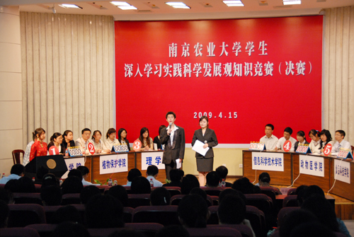 4月15日下午2:30,南京农业大学学生“深入学习实践科学发展观”知识竞赛(决赛)在图书馆报告厅进行。此次知识竞赛由校党委组织部主办。