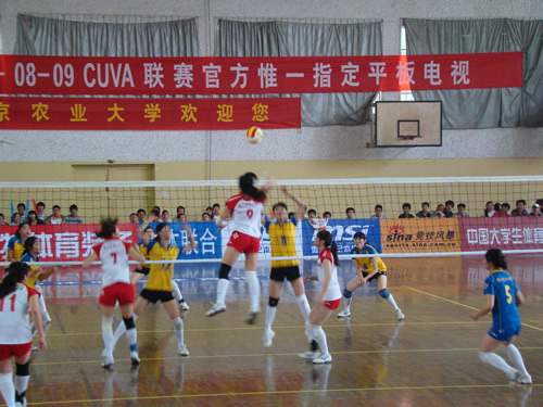 5月23日下午3:00,2008—2009中国大学生排球超级联赛第五轮的比赛在校体育馆隆重举行,南京农大女子排球队主场,迎战北京交大女子排球队。中国大学生排球协会秘书长刘国庆、南京农业大学学工处刘营军处长等有关部门的领导亲临比赛现场观战。比赛在国歌声中拉开帷幕,在经过历时一个半小时的奋力拼杀,我校女子排球队以3:1力克北京交大女子排球队,取得了主场比赛的胜利,她们将于5月30日客场挑战北京交大,希望她们再接再厉,发扬拼搏精神,再创佳绩,为校争光!