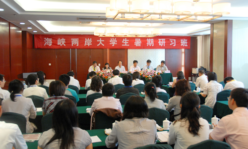 7月11日,“两岸大学生暑期研习班”开班仪式在我校学术交流中心隆重举行。来自台湾大学、中兴大学、嘉义大学和中华技术学院等台湾四所高校的30余名师生将与我校园艺学院、农学院、食品科技学院、经济管理学院和人文学院的30余名师生进行为期10天的交流活动。台湾中兴大学应用经济学系万钟汶教授、嘉义大学研究发展处处长侯嘉政教授、中华技术学院食品科学系林娟娟教授应邀率团来访。这是我校举办的层次最高、规模最大的一次两岸学生交流活动,将为我校与台湾高校的合作与交流注入新的活力。