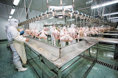 换上经过消毒的工作服后,记者进入了屠宰加工车间,只见工人们个个身穿工作服、头戴工作帽和口罩,而一只只已经被去毛的鸡则被悬挂在流水线上匀速移动着,工人们只需对传送至自己位置的鸡完成1~2个规定动作,切下鸡腿、分离大小腿、切下鸡翅等。副董事长崔祥华介绍,整个车间一共有100多道工序,将一只活鸡从宰杀到分解成鸡腿、鸡脖、鸡翅、鸡胸肉等各个部分,而完成这100多道工序只需1小时左右。崔祥华介绍,公司的设计规模是每天宰杀5万只,而目前的产量是每天3~4万只,目前车间共有300多名工人。