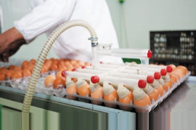 在流水线的一头,几位工人正忙碌着将鸡蛋摆放至5×6规格的盒中,然后用一个吸盘将鸡蛋集体搬运至流水线上。鸡蛋首先进入一个光学检测箱中,以检测鸡蛋是否完好,如果发现破损,机器会发出指定的响声以提醒工作人员及时将破损的鸡蛋取出。随之,鸡蛋又进入一道承重工序,“鸡蛋也有大小个,我们设定一个常规重量,如果鸡蛋通过这里承重后没有达到这个重量,流水线就会自动将这枚鸡蛋剔除,滚落到平台上。”记者看到,流水线随之将鸡蛋逐个传送至清洗箱,清洗完毕的鸡蛋随后又被快速烘干,然后又逐个喷印上商标和代码。