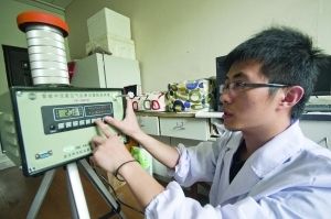 演示如何检测油烟中的PM2.5。 金陵晚报记者朱仲杰摄