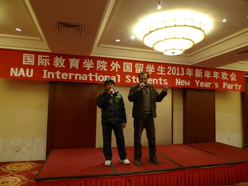 随后,在优美的音乐声中新年联欢会拉开帷幕。留学生和老师们热情高涨,纷纷自告奋勇地表演节目。赤道几内亚的留学生奥巴马(REGINALDO, ANDRES OWONO)演唱了自己创作的中文歌曲,凯勒瑞(KALERI GHULAM MURTAZA)以一首悠扬的巴基斯坦民歌将大家带到了他的祖国,来自越南的武黄方安(VOHU YNH PHUONG AN)的《童话》和巴基斯坦贾米拉(SOOMRO, JAMILA )的《快乐老家》都展示了我校留学生活力四射的青春气息。联欢会中间还穿插着令人兴奋的抽奖环节,整场联欢会用歌声赞美明天,用充满活力和激情的演绎表达着良好的祝愿。