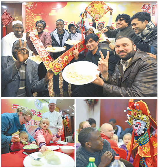 2月4日下午,中国结、红灯笼、金福字将学术交流中心紫金厅装扮一新,来自20多个国家的50余名留学生和中国学生一起包饺子、观川剧变脸、学杂技,体验中国传统文化,欢度中国新年。