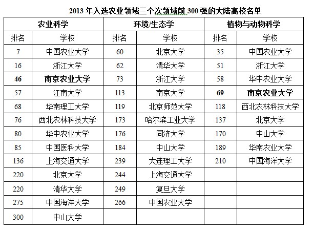 2013年入选农业领域前300强的大陆高校共11所,分别是浙江大学(38位)、中国农业大学(42位)、北京大学(88位)、南京农业大学(109位)、清华大学(125位)、华中农业大学(138位)、中山大学(187位)、西北农林科技大学(201位)、南京大学(238位)、北京师范大学(249位)、中国海洋大学(280位)。入选高校较2012年增加4所,且11所高校较2012年排名都有提升。