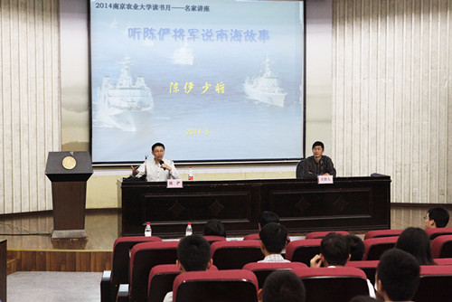 5月14日下午,南海舰队政治部原副主任、中国海军第五批亚丁湾护航编队政委陈俨少将做客我校“2014年读书月”系列活动之“名家讲坛”,为广大师生细说南海故事、展示南海美丽。图书馆党总支书记查贵庭主持了报告会。