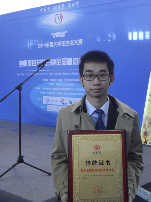 11月4日,由2014年“创青春”全国大学生创业大赛组委会和广州股权交易中心联合创建的“青年大学生创业板”举行推介会和首批项目挂牌仪式,我校学生创办企业“南京多恩环保科技有限公司”成功挂牌。团中央学校部部长杜汇良出席活动并讲话,共青团江苏省委党组成员、省少先队总辅导员姜东出席活动并参观了我校学生创业项目展示。