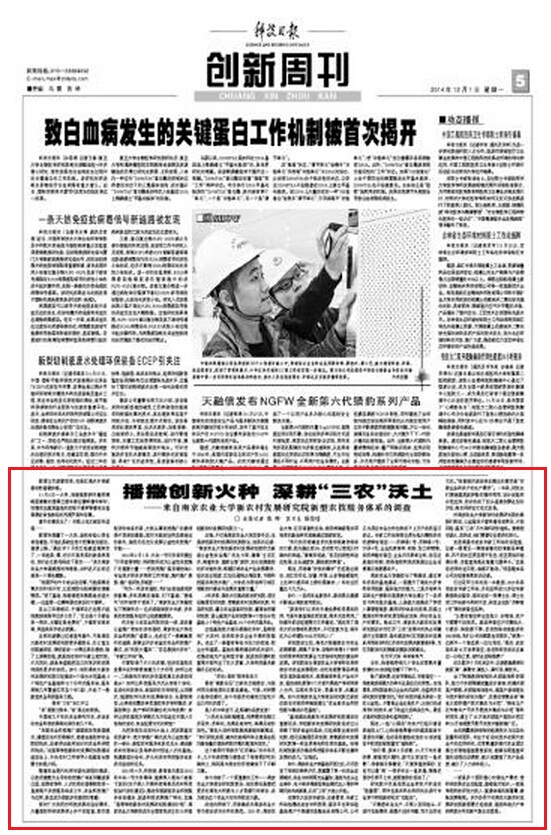 12月1日,《科技日报》创新周刊以5000字的篇幅,专版刊发我校近年来新农村发展研究院工作纪实。文章通过对活跃在农技服务一线师生的深入采访,对我校新农村发展研究院近年来探索出的创新模式、服务成效,以及通过科技服务对我校科学研究和人才培养的推动进行了总结呈现。