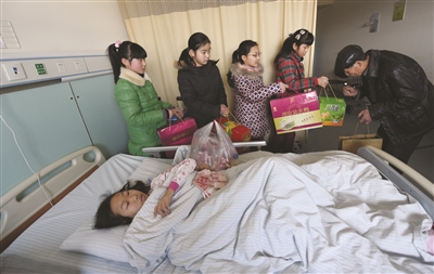 由扬子晚报和南农食品有限公司联办的“暖冬大行动”,今年是第10年。今年,“南农食品”在南京农业大学食品科技学院的支持下,一批学子和扬子晚报小读者一起,带着爱心年货,走入特困家庭,送去温馨的祝福。南农食品有限公司朱瑞华总经理告诉记者,今年南农食品将准备活鱼、米、肉、油、南农烧鸡、板鸭等组成爱心年货,走入南京市20个社区的特困家庭。此外,扬子晚报和南农一起,将组织外来务工者新市民爱心年货集中发放;对家有大病重病的,还有1000元爱心专款。除夕前,还给20户特困贫困家庭的孩子,按照1000元标准买新衣、新鞋。欢迎本报小记者和南京市中小学生参与。报名电话:96096。幸福的到来往往经历了等待和准备,而不幸却往往是突如其来的。不分男女,不辨老少,也不会因为一个人或一个家庭遭遇太多不幸,而对他们网开一面。南京市汤山街道龙尚社区的女孩殷可静,8岁时,父亲因病离开了人世,可静一直与母亲和新爸爸相依为命。可去年,她又被查出患上了严重的尿毒症。如今,她只能每天躺在第一人民医院的病床上,忍受透析带来的痛楚。昨天,本报记者、拉萨路小学和芳草园小学的小读者以及南农食品员工,带着爱心年货和爱心款,给她送去爱的祝福。通讯员 赵千迪