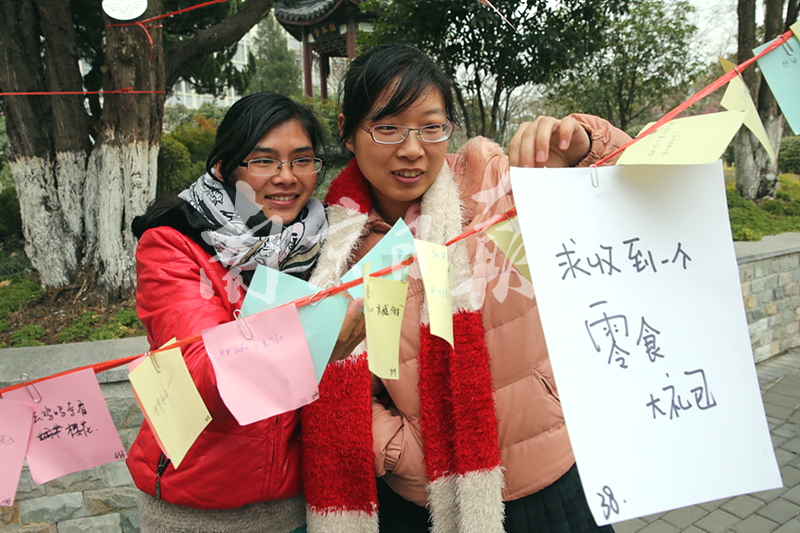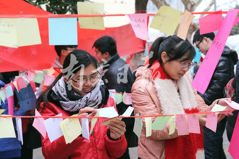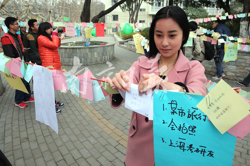 今天(3月7日),在南京农业大学校园内,女生在心愿墙上贴上一张许愿卡。当天,一年一度的女生节在南京农业大学举行,女生们在心愿墙上贴上许愿卡,期待有男生帮助实现。女生节许愿活动在南农已经连续举办三年,希望通过“你来许愿,我来实现”的互动活动,向大家倡导一种走出宿舍、走下网络的积极健康的交友方式。南报网记者 徐琦摄