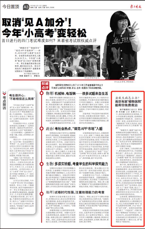 【扬子晚报】家里的盆栽生病了怎么办?别急,南农大有家“植物医院”,能帮你免费救治