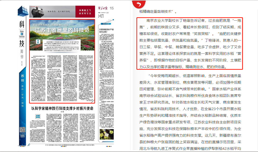 “今年受梅雨期超长、低温寡照影响,生产上面临苗情质量差异大、水浆管理难到位、病虫害易发等问题,必须加强中后期田间管理,弥补前期不良气候带来的影响。”国家水稻产业体系南京综合试验站站长、省农科院粮作所优良食味水稻团队首席专家王才林研究员说。针对各地水稻生长和天气灾害、病虫害发生情况,省农科院利用技术、人才优势,在全省23个市县开展水稻生产形势研判和精准技术指导,并结合水稻新品种培育、优质丰产绿色增效等国家重点研发专项、江苏农业科技自主创新项目实施,充分发挥农业科技在保障秋粮丰产丰收中的引领作用,为全省水稻稳产高产提供强有力的科技支撑。这几天,新疆察布查尔县的种粮大户张庭固的脸上笑容满溢,在他的直播示范田里,采用北斗导航九道工序复式作业旱直播种植的伊犁新稻42水稻平均产量为737.12公斤,比普遍采用的机插秧田增产119.62公斤。