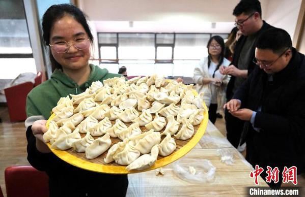 南京农业大学学生包饺子过冬至为考研加油。 泱波 摄