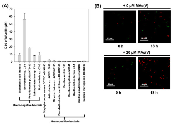 图1 (A)MAs(III)对14株不同种属细菌生长的半抑制浓度;(B)激光共聚焦照片显示添加和不添加20 µM MAs(V)对肠杆菌CZ-1(红色荧光标记)和枯草芽孢杆菌168(绿色荧光标记)共培养生长状态的影响。