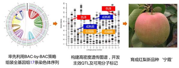 用分子标记定位重要性状,在梨树的育苗期内,就可以像在自助餐厅一样选择需要的性状,把梨的育种从“盲人摸象”似地长期作战,变成了高效精确的“靶向选择”,从而节省了大量的育种时间和育种用地,更有效提高了育种的效率