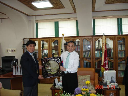 庆北大学校长金达雄教授会见代表团,对庄娱乐率领南京农业大学代表团到庆北大学参加60周年校庆表示热烈欢迎和衷心感谢。庄娱乐副书记代表我校校领导和广大师生向庆北大学60周年校庆表示热烈祝贺,并赠送了礼品。会谈中,双方各自介绍了学校办学特色、发展目标、人才培养、科学研究等方面的情况,并就进一步加强两校间的科研合作、教师交流、学生交流、科研信息交流等问题进行了深入的讨论。