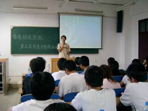 在2006年的6月4日,信息科技学院又迎来了本学年的一大盛事,当晚6:30在中心楼B614举行了第五届学生干部选举大会。后浪前浪济济一堂,为信息院的发展旅程立下了新的丰碑。