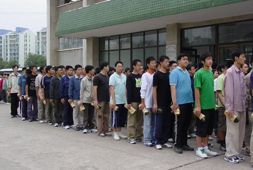 领到军鞋了,朴实无华的外表展现出我军艰苦朴素的传统,此刻新生们也格外珍惜,一手稳稳的拿着军鞋,整齐的站着队列,那神态俨然自己已经从一个柔弱书生变成一个钢铁战士。