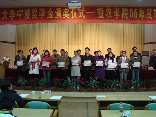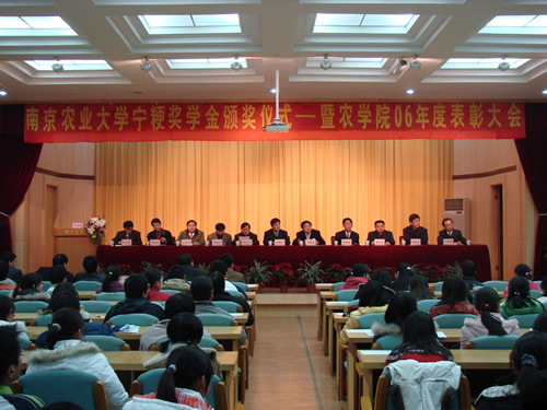 12月21日下午,南京农业大学首届宁粳奖学金颁奖典礼暨农学院06年度表彰大会在金陵国际研究院报告厅隆重举行。校党委副书记庄娱乐教授、中国农科院作物所所长万建民教授、江苏省科技厅农村处杨天和处长、江苏省农林厅种子站周春和站长、江苏省作栽站邓建平站长、盐城种子公司副总经理李秋生先生、上海农场副厂长柳玉标、研究生院副院长董维春教授、校学工处处长刘营军处长及农学院全体领导、班主任和获得首届宁粳奖学金及本年度受到表彰的两百余名同学参加了大会。仪式由农学院党委书记李昌新主持。