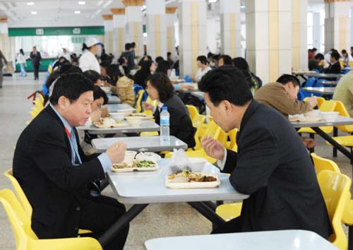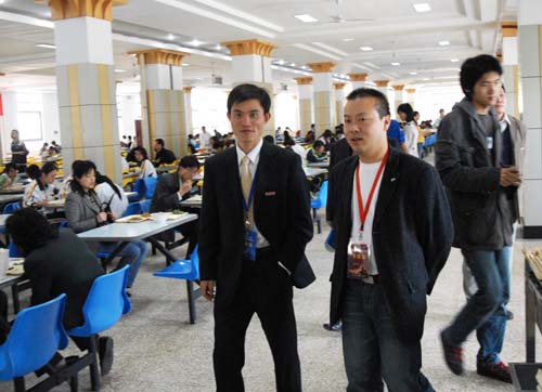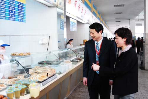 在后勤集团党总支书记陈兴华、总经理许泉等负责人的陪同下,专家考察了学生南苑食堂的设施、饭菜品种、质量、价格,了解了伙食管理委员会、参赛选手菜肴制作、免费汤供应等情况,听取了陪同人员对餐厅设置、餐厅服务、学生就餐总体情况的详细介绍。之后,专家分头在我校学生南苑一、二、三食堂与学生一起就餐。