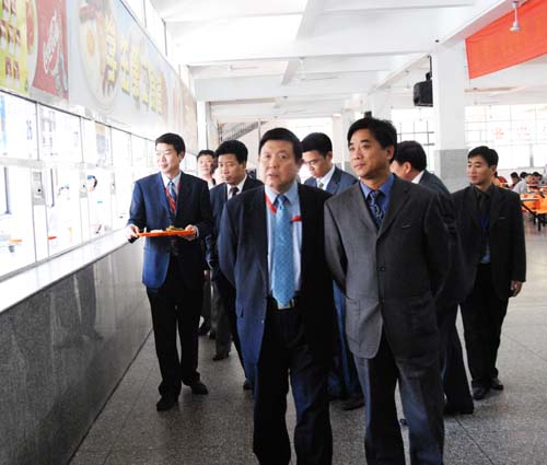 4月25日中午,教育部评估专家王耀中教授、李玉教授、周建华教授、祁克宗教授、张新虎教授、刘永泽教授、专家组秘书鄢高翔同志、教育部高斌同志等在走访部门、学院后,又分头分批来到学生食堂进行考察。