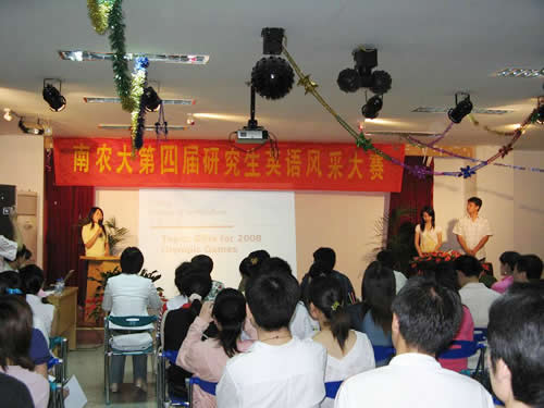 2007年5月12号晚6时30分南京农业大学研究生学术报告厅灯火通明,鲜花伴着欢呼声缭绕不绝。在主持人成玮、曹文热情洋溢的开幕词中第四届“神农杯”研究生英语风采大赛决赛拉开了赛幕。