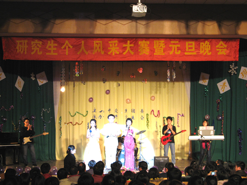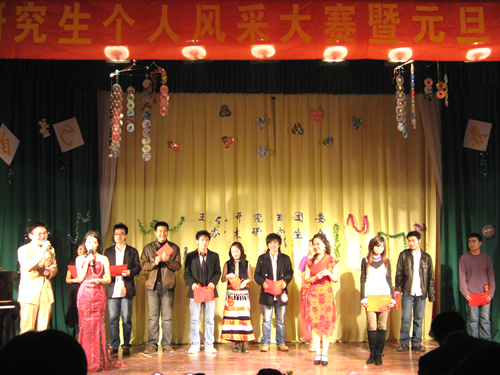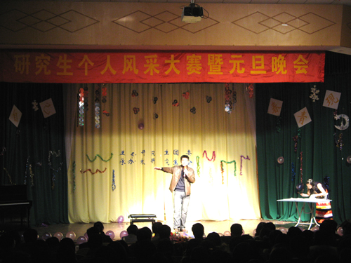 在紧锣密鼓的准备下,研究生个人风采大赛暨元旦晚会于2007年12月26日晚七点整在大学生活动中心隆重举行,整场晚会才艺飞扬、激情绽放,取得了圆满的成功。校党委庄娱乐副书记、研究生工作部董维春部长、学生工作处刘营军处长、研究生工作部宋华明副部长、研究生院办公室李献斌主任以及部分学院党委副书记、研究生秘书、研究生院全体工作人员、兄弟院校的代表等应邀参加本场晚会。本次活动由研究生团委主办,校研究生会承办。