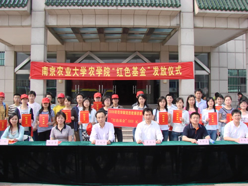 下午3:00,在新四军纪念馆前举行了农学院“红色基金”发放仪式。“红色基金”是在农学院党委倡议下于2003年9月成立,由农学院党员教师以特殊党费形式捐助设立,凝聚着全院党员、教师对同学们成长、成才的至诚关怀和殷切希望,目的资助好学上进、素质优秀的困难学生和党员,帮助他们树立更高的人生理想,更好地完成学业。红色基金于2004年开始发放,4年来累计资助学生党员29人,资助金额总计14151元。2008年农学院党委共募集“红色基金”6000元,资助研究生、本科生党员各10名,同时资助08年受雪灾影响严重地区同学5名。