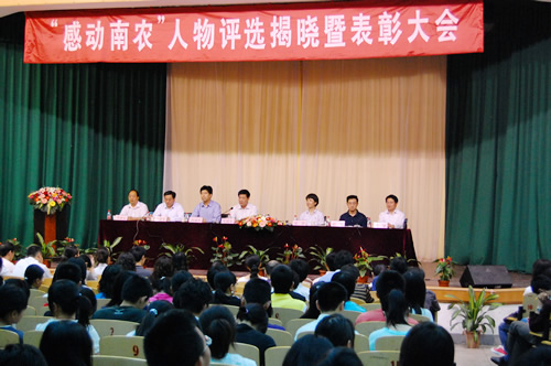 大会在庄严的国歌声中开始,曲福田首先公布了“感动南农”优秀大学生(团队)评选结果。在首届“感动南农”优秀大学生(团队)评选活动中,“挥洒青春热血,绽放人生光彩”的西部计划优秀志愿者工学院汤二征同学,“捐肝救父,孝感天地,为父亲捐出55%肝脏”的生科院黄晶晶同学,“团结拼搏,争创佳绩,以汗水和荣耀诠释南农精神”的校大学生女子排球队,“全面发展,学业优异,用热情炫亮青春”的动科院蔡思佳同学,“拼搏,探索,永不服输的科技创新之星”工学院刘龙申同学 ,“风雨无阻十一年,用爱心托起希望的蓝天”的园艺院月牙湖社区特教服务队 ,“坚韧执着,自强自立的自强之星”农学院陈益琳同学当选首届“感动南农”优秀大学生(团队),另外资环院张云翼同学,人文院 单静、徐进利、朱辰明同学,动医院孟婕、王中友同学获提名奖。