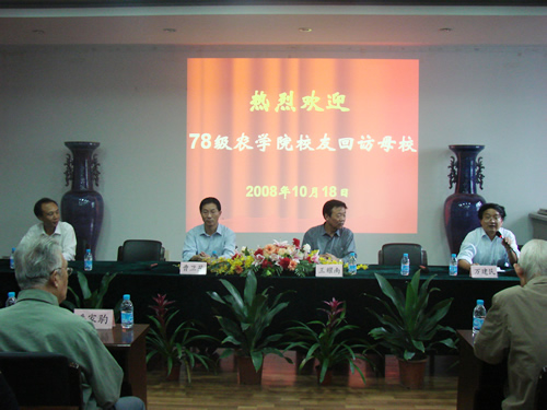 会上,万建民教授首先对78级校友回访母校表示热烈的欢迎,介绍了到会的各位嘉宾。并对校友们多年来对学校的关心和支持表示感谢,预祝他们在各自的岗位上取得更辉煌的业绩。曹卫星副校长向各位校友多年来的关心和支持表达了感谢,表示南农的发展离不开校友们的关心和支持,希望各位校友能经常会校看看,学校真诚的欢迎每一位校友的回访。校友会常务副会长王耀南也对校友们表达了欢迎和祝福。