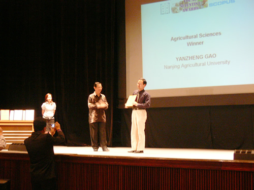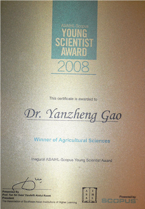 本届青年科学家奖评选的对象为亚太地区(Asia-Pacific Region)年龄小于40岁的青年学者。共分为生命科学(Life Science)、农业科学(Agricultural Science)、工程与技术(Engineering and Technology)、医学(Medicine)四个学科领域,分别各评选出一位获选者。评选的标准为:①文章、专利等研究成果,②文章的国际引文情况及H-index,③研究成果的社会价值(Social impact)。经过国际专家多轮评审,高彦征副教授喜获农业科学(Agricultural Science)的青年科学家奖,也是本届各学科领域中国大陆的唯一获选者。其它学科领域的获奖者分别是:工程与技术领域Chi-Chang Hu教授,医学领域man-Fung Yuen教授,生命科学领域Kuo-l Lin教授。