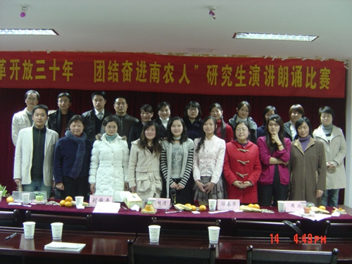 此次演讲朗诵比赛以“改革开放三十年 团结奋进南农人”为主题,是研究生团委纪念改革开放三十周年系列活动的重要组成部分,也是我校近年来首次举办的研究生大型演讲比赛类活动。这次比赛不仅是各学院研究生同学交流自己对改革开放三十周年的思索和探求,也是同学们展示个人风采的绚丽舞台。(园艺院研会供稿 研究生通讯社修改)
