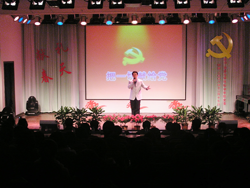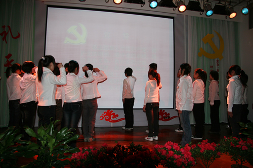 演出在庄严肃穆的《国际歌》声中正式拉开帷幕。鲜红的党旗前,高唱着国际歌的师生党员再次重温了入党誓词,奠定了整场晚会庄重的氛围。随着背景屏幕上图片的变换,我们跟随着中国共产党发展的足迹穿梭在祖国的百年复兴中,感受着祖国改革开放三十年来的沧桑巨变,同时,也体会着作为南农人、资环人的自豪与骄傲。