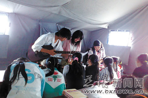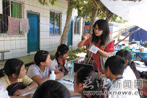 灾区生活条件相当艰苦,“住的简易帐蓬一下雨就会渗进水来,而天晴时又热得像蒸笼,还有每天都要工作15个小时以上,从早忙到晚,实在太累了。”徐文说,志愿者团队每晚都要集中做个当日工作小结,并布置第二天的工作,很多时候,因为实在太累了,会议开着开着大家都睡着了。因为实在忍受不了,不少志愿者呆了几天后便离开了,徐文却坚持留了下来。支持徐文留下来的动力是,这里非常需要她,特别是孩子们,对她们进行心理疏导和安抚是志愿者工作中尤为重要的一项。针对孩子们不同的情况,徐文和她的志愿者团队积极开展心理治疗,为解决孩子们的心理问题,她们买来水粉颜料、油画棒,通过绘画来疏导他们的焦虑。