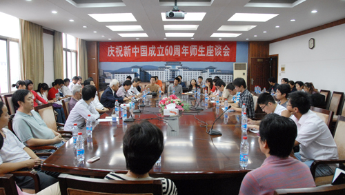 9月16日下午,学校在行政楼613会议室召开庆祝新中国成立60周年师生座谈会。来自各学院各单位的教师和学生代表共50多人参加会议,我校两位离休干部王元林、郭锐敏应邀出席座谈会,校党委副书记花亚纯到会并作重要发言,副校长徐翔主持座谈会。