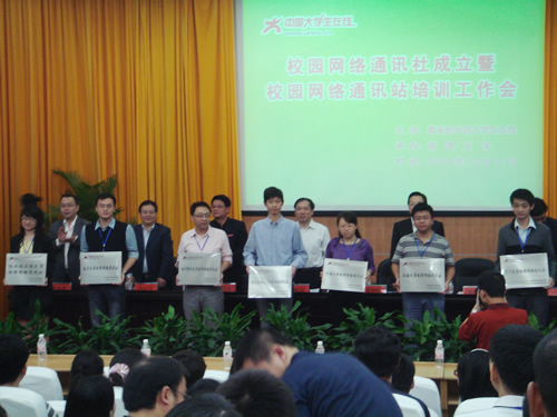 清华大学、北京大学、上海交通大学、南京农业大学等82所高校代表接过中国大学生在线校园网络通讯站的牌匾,成为网通社的首批通讯站。