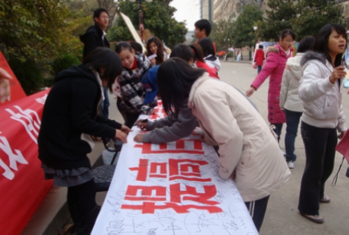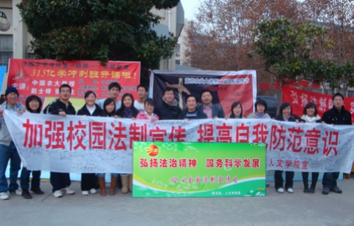 2009年校园法制宣传活动由校园安全防范知识展、“加强校园法制宣传、提高自我防范意识”签名、法律知识问答等活动组成。精心制作的校园安全防范知识宣传展板为学生再现了一个个真实的案例,同时介绍了如何在校园内提高自身的防范意识,保护学生人身财产不受侵害。观看展出的学生在法律系学生的倡议下,在“加强校园法制宣传、提高自我防范意识”签名横幅上庄严地留下了自己的姓名。此次活动,法律系同学还精心准备了法律知识问答活动,参与活动的同学在轻松愉快的气氛中学到了不少身边的法律常识。半天的活动得到全校学生的积极响应,每一个参与活动的南农学子均表示将认真学习有关法律知识,积极为和谐校园建设做应有的贡献。