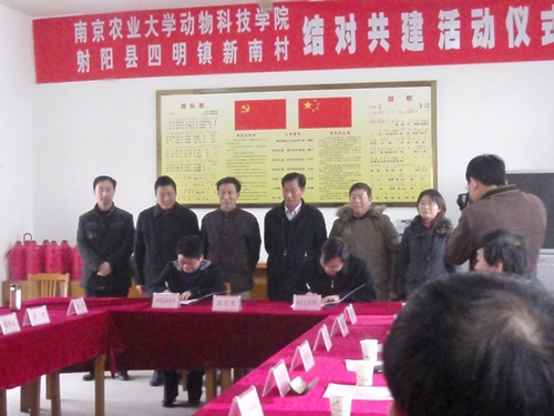 为了进一步了解农村科技需求,更好地为“三农”服务,真正将产学研结合落到实处,提升学院的教学科研水平,学院党委决定以新南村为服务、调研对象,积极探索为江苏新农村建设服务的新思路、新途径。本活动内容主要包括共谋发展、签订协议、科技培训和参观考察四个部分。当地政府对该活动给予高度重视和支持,射阳县政协副主席刘守明、射阳县组织部副部长戴淦、四明镇党委书记苗鸿程等十多位地方政府领导全程参加了此次活动。通过座谈交流,大家在“三农”问题和新农村建设方面达成共识,现院党政班子成员、前任书记张剑中代表学院作了重点发言,他指出南京农业大学是解决“三农”问题的科技源头、人才资源库和服务平台,送科技进乡村是我们的义务和责任。教师四支部党员、学院党委书记闫祥林代表学院与四明镇新南村签订了共建协议,在产学研合作、科技致富、创业基地建设、党建交流等方面形成合作意向。养禽专家杜文兴、淡水养殖专家郭文汉专门为禽业合作社、水产养殖合作社及养殖户60多人进行技术培训,和村民们进行了零距离接触,面对面交流,就关键的养殖技术给广大农民朋友进行了通俗易懂的讲解,得到了村民的高度评价。最后,在当地政府领导的陪同下,大家共同参观考察了新南村养殖业服务中心、淡水养殖基地、大学生村官创业富民基地、林下草鸡养殖场、芦苇编织加工场等等,并对存在的技术问题给予现场指导。