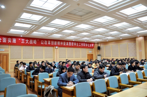 随后花亚纯谈到了“三大战略”的实施问题。“三大战略”的实施,首先是我校学生工作发展的阶段性任务,是以往学生工作方法、经验的全面概括,不仅涉及到学生培养的各个方面,还涉及到学生工作队伍的自身建设;第二,“三大战略”是我校学生工作的基础性任务,是我校人才培养目标的关键所在;第三,“三大战略”具有引领性,引领我校日常教育活动的开展。在具体实施过程中,“三大战略”将不打乱学生工作的常规工作,不增加工作负担,也不单独进行检查评比。“三大战略”将以改革创新精神进行推动,鼓励各个学院以不同方式方法进行创新,差异化发展。同时,学校也将以科学的思想作为制度,以科学的制度加以保证,以科学的方法来推进“三大战略”,紧紧围绕学校人才培养目标,使其充分渗入我校日常学生工作去。