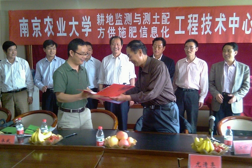 会议最后,王承武副教授和黑大壮肥业有限公司总经理尤清亮签订了“耕地监测与精准测土配方施肥信息化技术”全面合作协议书,与胡学亮、江方众、尤清亮四人举行了“耕地监测与精准测土配方施肥信息化工程技术中心”揭牌仪式。