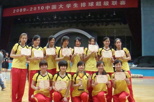 在北京航空航天大学赛区的四强排位赛,女排队员继续发扬团结拼搏和亮剑精神,与山东大学队厮杀五局,以3:2取胜,最终获得全国大学生排球联赛超级赛季军的优异成绩,这也是我校女排建队以来取得的最好成绩。