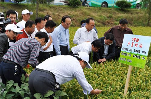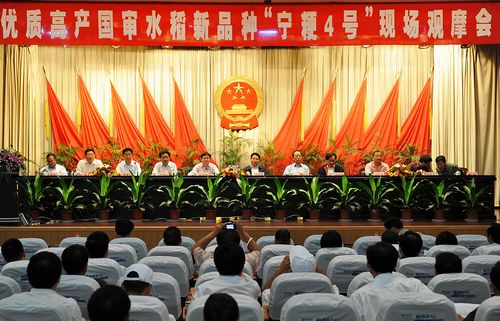9月24日,南京农业大学万建民教授课题组培育的优质高产国审水稻新品种“宁粳4号”在泰州兴化举行了现场观摩会。农业部种植业司司长叶贞琴、江苏省人大原副主任凌启鸿、江苏省农委副主任张坚勇、南京农业大学副校长沈其荣、中国农业科学院作物所所长万建民、江苏省种子站站长周春和、江苏省作栽站站长邓建平、兴化市副市长顾国平、南京农业大学产学研处处长陈巍、农学院院长丁艳锋以及徐州丰县、连云港赣榆、沭阳等34个县级农业局分管局长、作栽站长、种子站长等一共200多人出席了现场观摩会。
