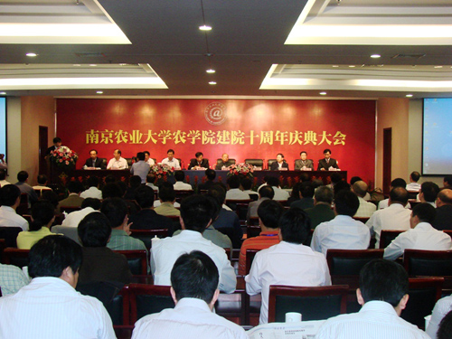 2010年10月2日,南京农业大学农学院建院十周年庆典大会在南农学术交流中心隆重举行。应邀莅临庆典大会的嘉宾有:中国农科院院长翟虎渠、江苏省副省长曹卫星、中国工程院院士盖钧镒、南京农业大学党委书记管恒禄、中国农业科学院作物所所长万建民、农业部农村社会事业发展中心主任王守聪、农业部机关服务局书记司洪文、江西省农业科学院院长谢金水、中国水稻研究所所长程式华、江苏省农业委员会副主任张坚勇、常州市副市长张耀刚、南京农业大学副校长孙健、南京农业大学副校长周光宏等。农学院原党委书记汤一卒、农学院院长丁艳锋、农学院党委书记李昌新出席大会。各兄弟院校、科研院所代表,我校部分职能部门及学院负责人,海内外校友和部分在校师生参加了庆典大会。大会由李昌新主持。