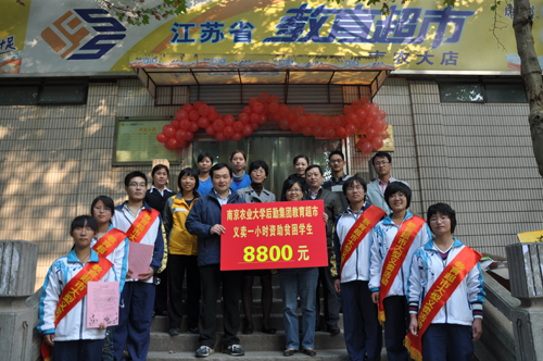据悉,今年是江苏省教育超市成立十周年。多年来,我校教育超市始终把关心资助贫困学生作为自己的责任和义务,坚持面向家庭贫困学生公开招聘勤工助学兼职岗位,开展义卖资助或直接资助形式帮助特困学生,并配合江苏省慈善总会向家庭贫困学生发放教育超市免费购物券,免费配送学习生活用品。2008年,我校后勤集团公司设立了“南京农业大学教育超市”新生助学金。截至2010年,共49名同学享受此项资助。
