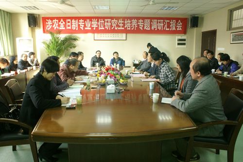 2010年11月20日,以西北农林科技大学副校长王跃进教授为组长,中国学位与研究生教育学会农林工作委员会会同全国农业推广硕士、兽医硕士、风景园林硕士专业学位教育指导委员会共同组织的专家组一行五人,来我校开展涉农全日制专业学位硕士研究生培养专项调研工作。专家组成员包括青岛农业大学郑国生教授、南京农业大学罗英姿教授、南京林业大学叶建仁教授、东北林业大学李春英老师。国务院学位办农工处欧百钢处长参加了调研会。