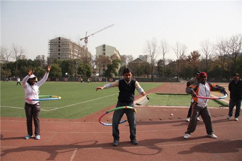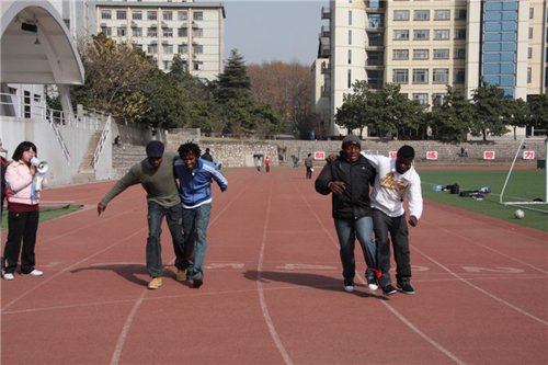 11日上午,举行了中外学生趣味运动会,项目包括跳绳、踢毽子、两人三腿、螃蟹赛跑和转呼啦圈等。同学们积极报名,踊跃参加,在娱乐的同时也加深了中外学生的友谊。下午的足球赛在国际教育学院和外国语学院之间展开,留学生们奋勇拼搏,最终以4:1的成绩赢得了本场比赛。