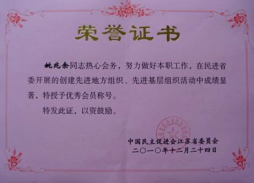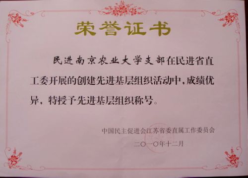 1月20日,中国民主促进会江苏省直工委举行表彰大会,对在2010年创先争优活动中表现突出的基层组织进行了表彰,我校民进支部获得“民进省直先进基层组织”称号。此前,在中国民主促进会江苏省委召开的表彰会上,我校民进支部副主委姚兆余教授被授予“民进江苏省优秀会员”。